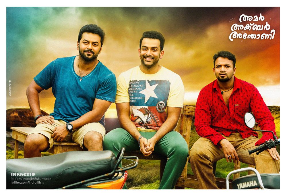 The performances by the talented trio of Prithviraj, Indrajith and Jayasurya pack a punch.Prithvi looks handsome, Indrajith's singing moments are a scream and JayaSurya strikes an endearing balance as the physically challenged loverboy.Namitha Pramod as the leading lady is not given her due except for a few song sequences.The supporting actors playing the parents and family members of the trio are notable and invest sincerity in their parts.K.P.A.C.Lalitha and Bindu Pancikar as Amar and Akbar's mothers are a riot.Meenakshi playing the child abuse victim Fathima is a joy to watch and her song number on stage is mellifluous.Asif Ali plays an extended cameo.The music barring the child artiste's number is purely drowned in commerce and tangy beats.