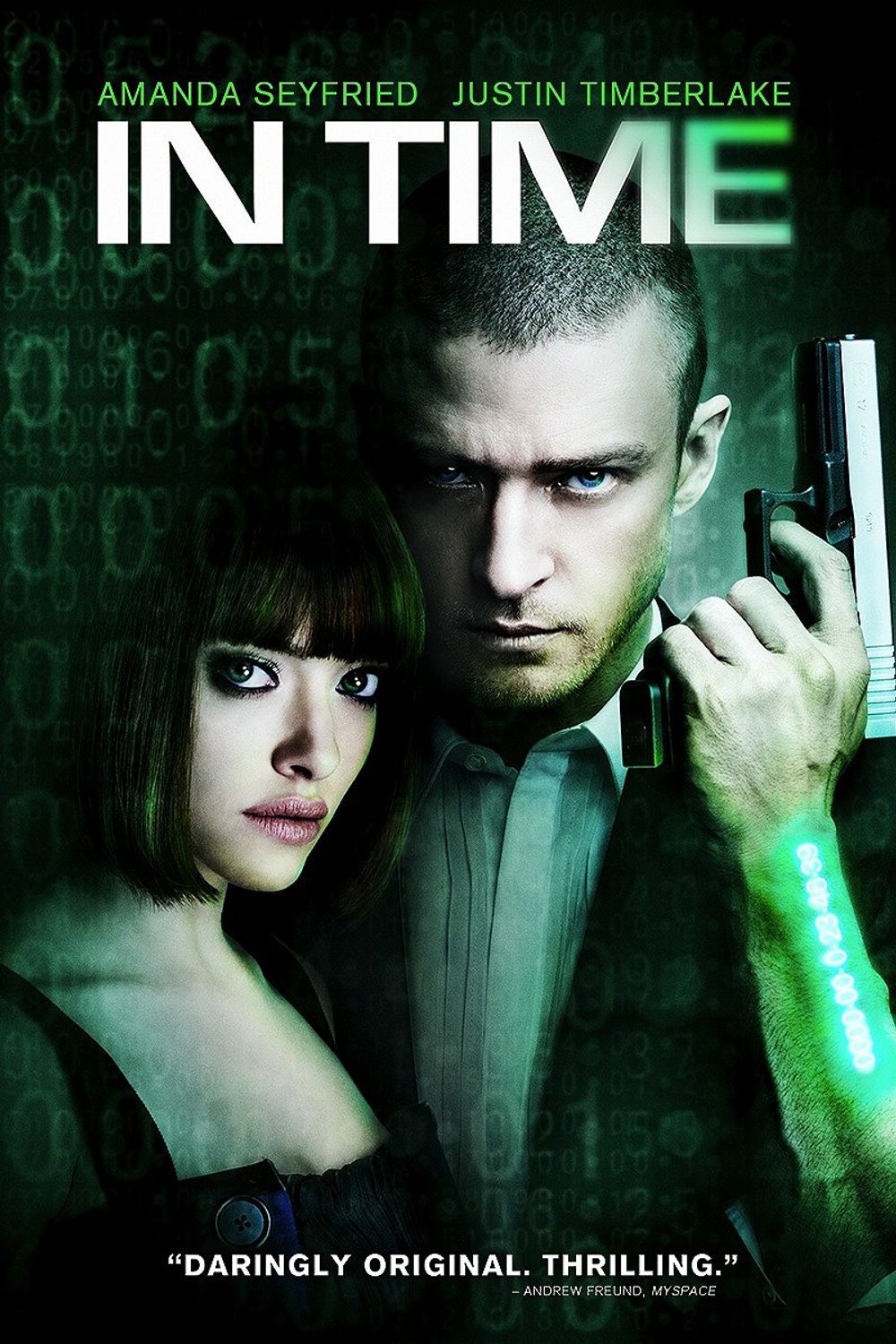 Will Salas (Justin Timberlake) is a young man living in Dayton, a poor ghetto in the southwest USA. He lives day by day, making just enough to pass each day sharing time currency with his perpetually youthful mother, Rachel Salas (Olivia Wilde). She is 50 today, but has two days work in the garment district, she gives Will 30 mins for lunch. They will celebrate when she gets back. Everyone has a luminous green digital clock on their arms, counting down. Will is generous and easily gives 5 mins to a young beggar girl, Maya.
