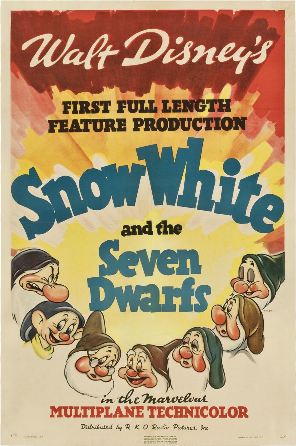 The Queen goes to the cottage while the dwarfs are away, but the animals are wary of her and rush off to find the dwarfs. The Queen tricks Snow White into biting into the poisoned apple. As Snow White falls asleep the Queen proclaims that she will be the fairest of the land. The dwarfs return as the Queen leaves the cottage and give chase, trapping her on a cliff. She tries to roll a boulder over them but before she can do so, lightning strikes the cliff, causing her to fall to her death.